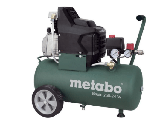 TOP 3 uzatvára kompresor Metabo Basic 250-24 W OF. Ide o olejový, piestový kompresor, s maximálnym tlakom 8 barov a výkonom 95 litrov za minútu. Objem tlakovej nádoby je 24 litrov a hmotnosť kompresora je 27 kg.