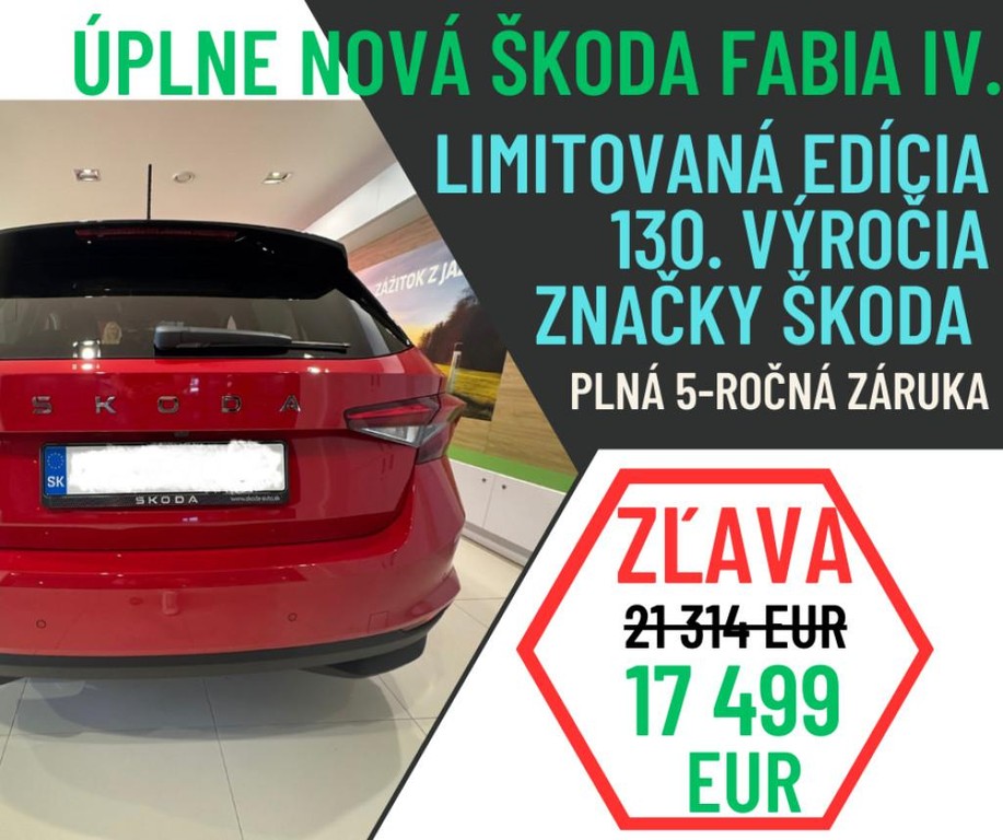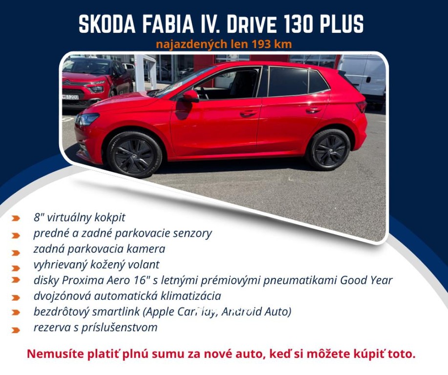 Predám úplne novú Škodu Fabiu IV. generácie, nepoužívanú, výhra v súťaži. Auto je v perfektnom stave, plná záruka, v bohatej výbave Drive 130 Plus, 1.0 TSI 70 kW (95 k), 5-stupňový manuál. Má bohatú príplatkovú výbavu., Má predné aj zadné parkovacie senzory, parkovaciu zadnú kameru, vyhrievaný volant, bezdrôtový carplay, rezervné koleso s príslušenstvom. Svetlá má LED, moderný virtuálny kokpit 8", v TP má zapísané aj 18stky. Navigácia: Google mapy alebo waze - pomocou pripojeného mobilu. Airbag 4X, Vyhrievané predné sedadlá, Výškovo nastaviteľné sedadlo vodiča, Asistent rozjazdu do kopca, Hlavové airbagy a bočné airbagy vpredu, Tempomat s obmedzovačom rýchlosti, Obmedzovač rýchlosti, LED hlavné svetlomety, 3. hlavová opierka vzadu, Dáždnik vo dverách na strane vodiča, Zadné sedadlá nedelené, zadné operadlá delené a sklopné v pomere 60:40, Bezdrôtový SmartLink, Lak ová opierka vpredu, Lane Assist - asistent udržiavania jazdy v jazdnom pruhu, Driver Alert - asistent rozpoznania únavy, 6 reproduktorov, Výškovo nastaviteľné predné sedadlá s manuálne nastaviteľnými bedrovými opierkami, Oceľové disky kolies 5,5J x 15